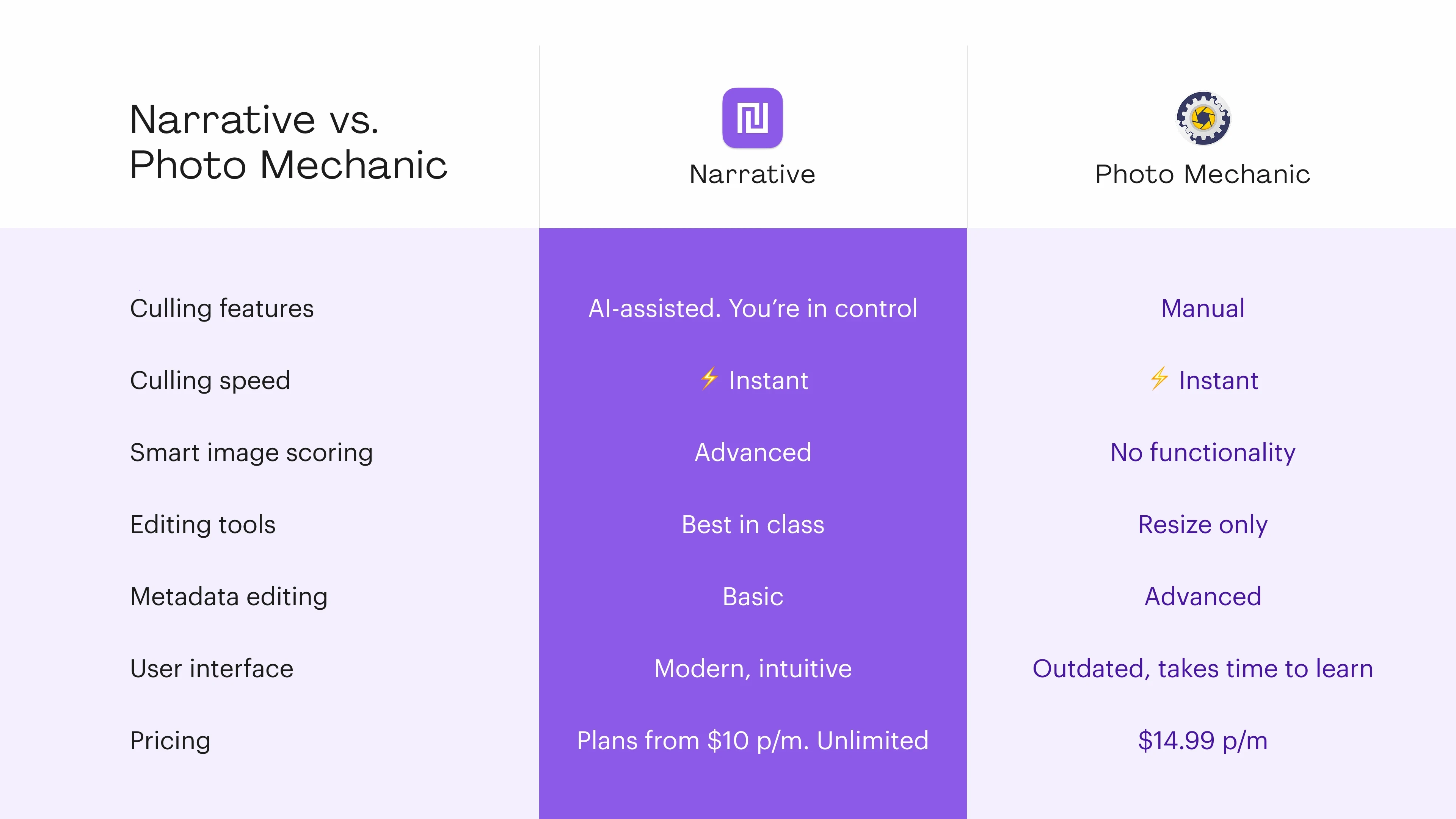Narrative offers a complete workflow solution that combines advanced AI culling with personalized editing in one seamless platform.